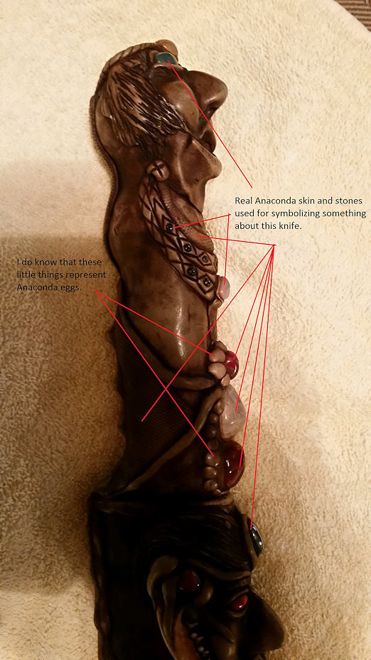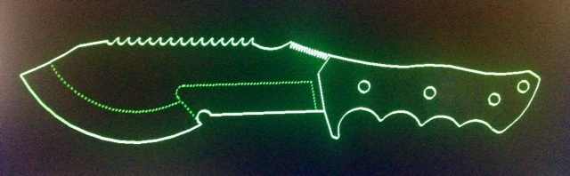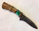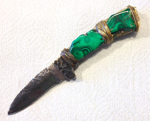 It's a "what to do with some lawnmower blade steel run over by a truck, some scrap malachite bought at a Navajo tourist trading post, and some old wood that kinda looks like antler. Oh, yes, and some rawhide and polyurethane varnish leftover from sealing your sundeck. Add a new-looking leather (black with white stitching) sheath and you get the whole unbalanced native rusting corpse steel drunk journey thing that you have to explain to your wife from the back of a patrol car in Sedona...