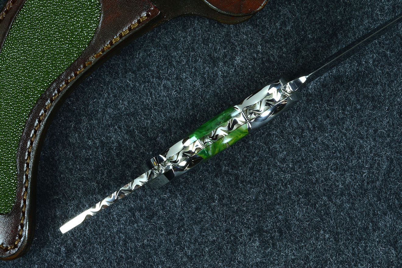 • Sheath: Hand-carved, hand-dyed leather shoulder inlaid with green rayskin, nylon stitching, stainless steel dot snap